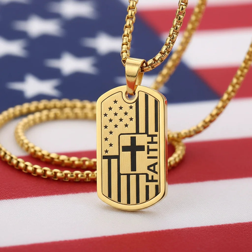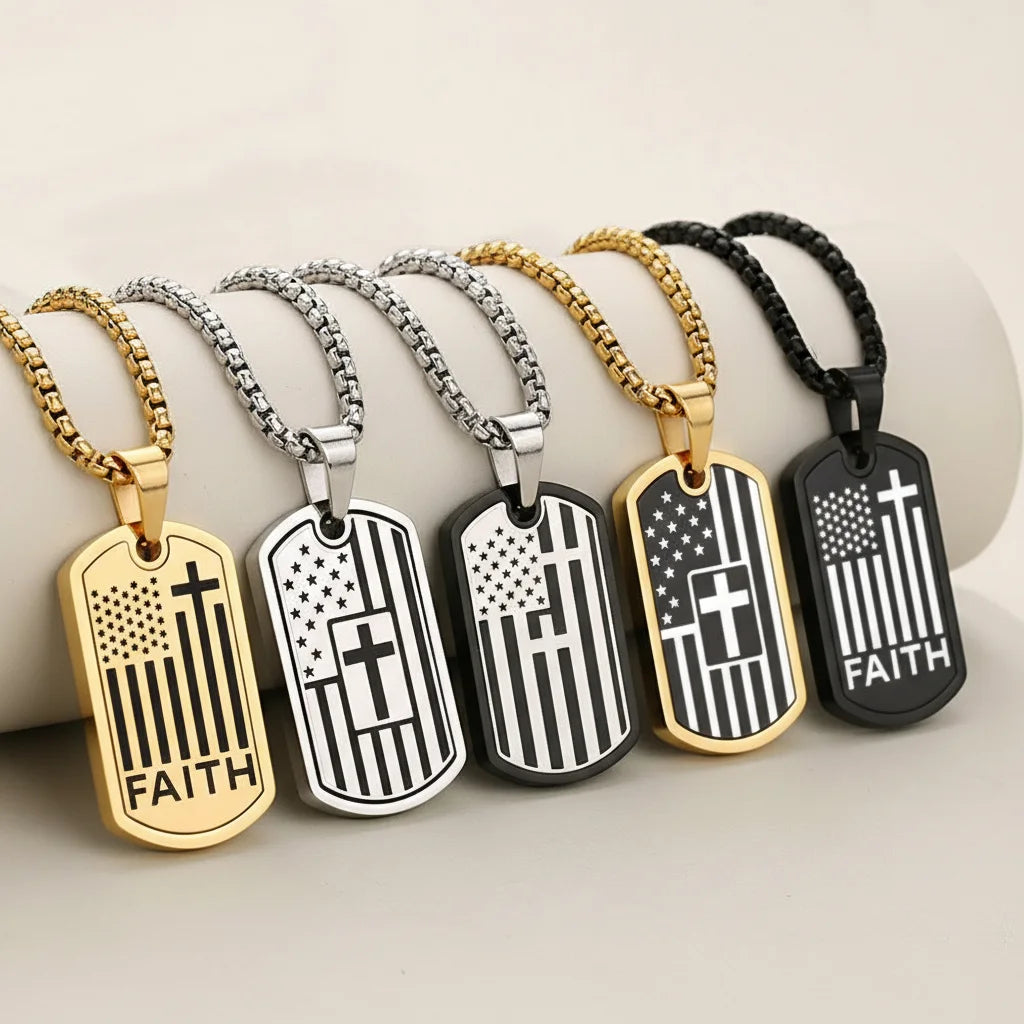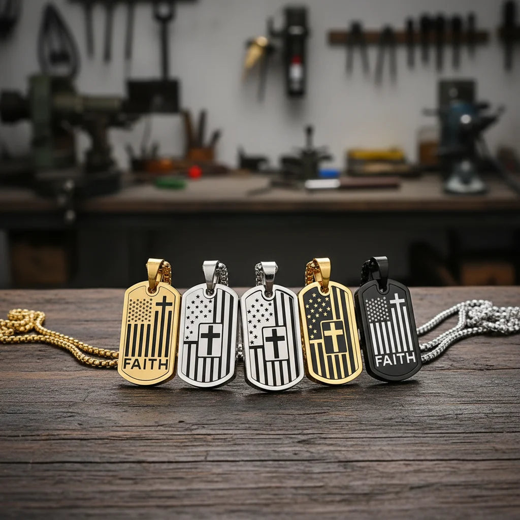 Each Faith Tag unites the cross, the flag, and the word 'FAITH,' a bold testament to your unwavering devotion to your nation and spirit.