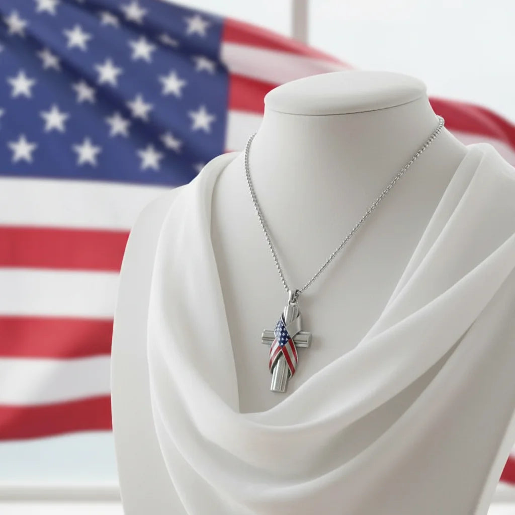 This elegant necklace is a heartfelt testament to your enduring faith and unwavering allegiance. It beautifully intertwines the grace of the cross with the spirit of our nation, crafted for those who carry their beliefs with pride and purpose every single day.