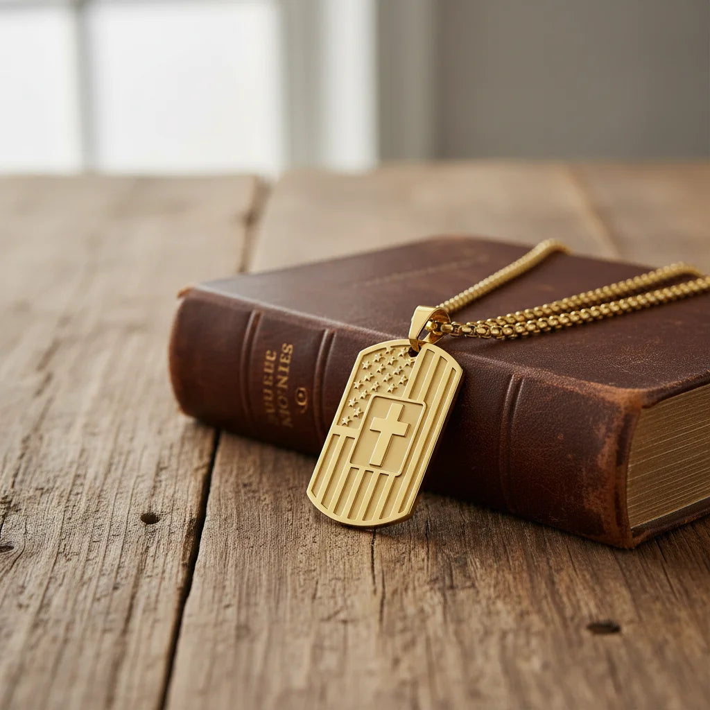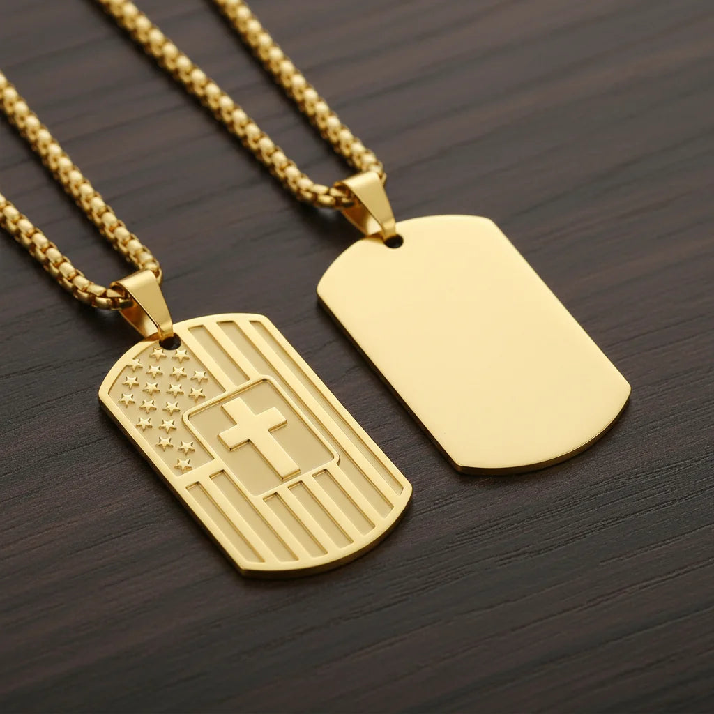 One tag boldly bears the revered American flag intertwined with a cross, a profound testament to your unwavering allegiance to both spiritual freedom and national heritage. The accompanying minimalist tag offers a subtle yet powerful expression, allowing your conviction to shine with quiet distinction.