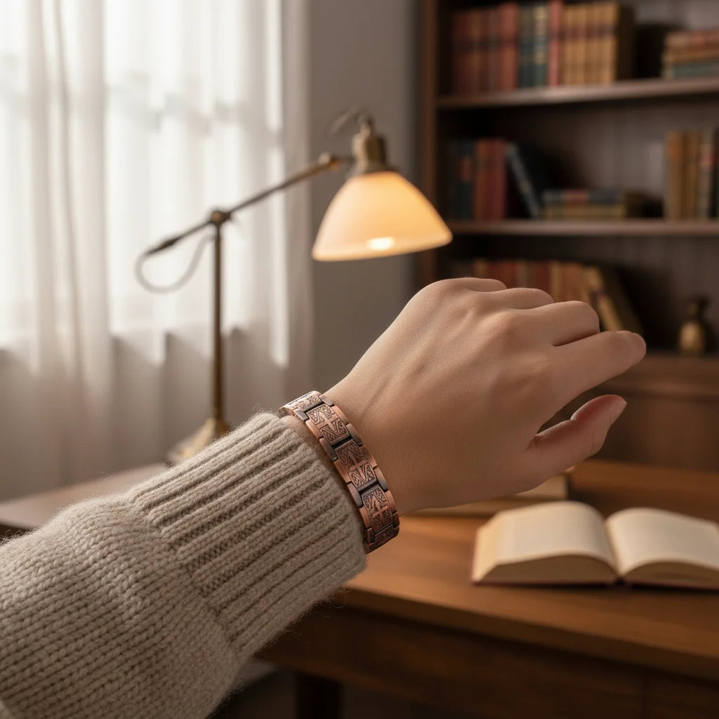 The warm embrace of copper not only lends a timeless elegance but also offers its unique grounding energy. This cherished material deepens the bracelet's character over time, reflecting the enduring strength of your spirit.